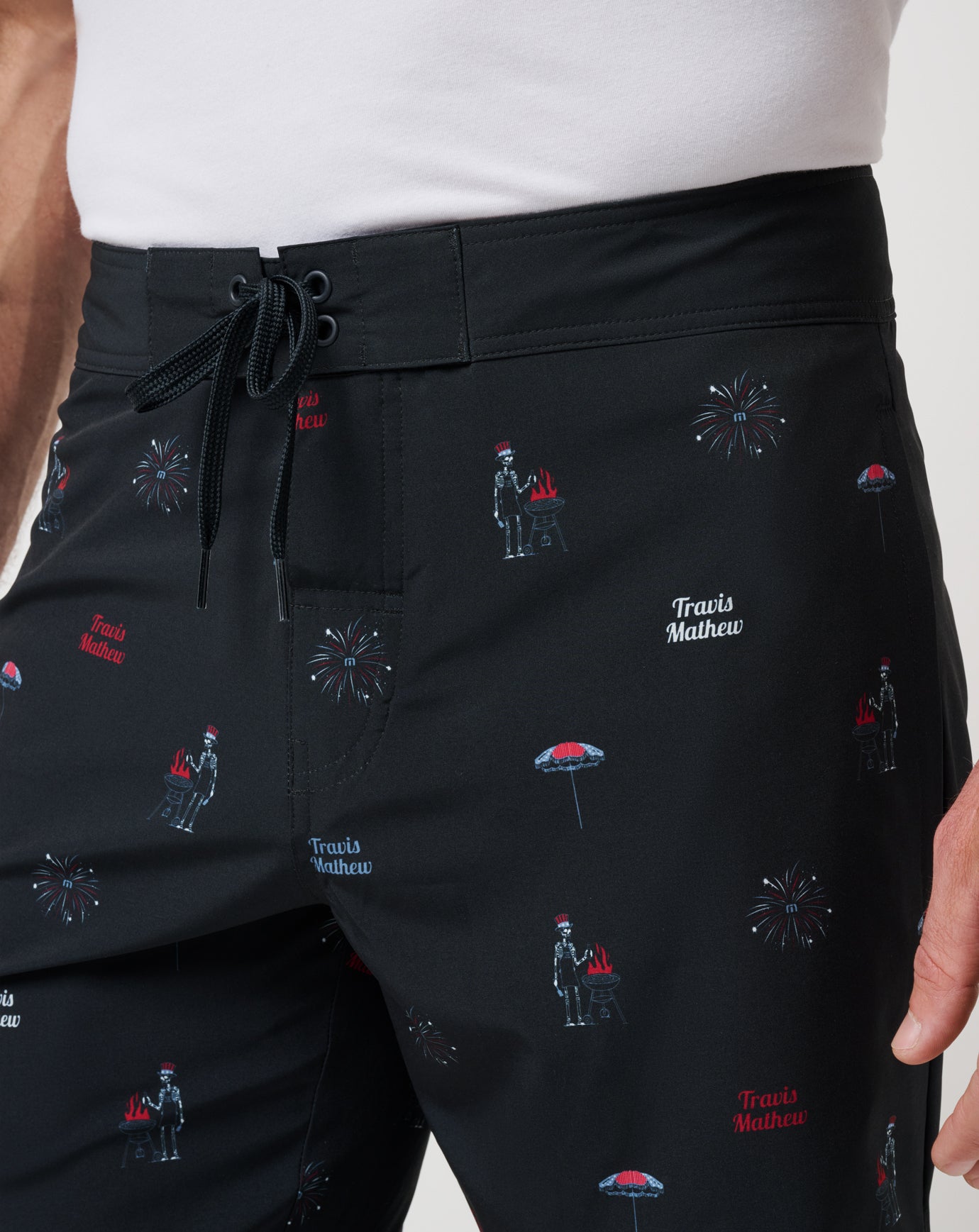 Grills fired up. Fireworks queued. The RED WHITE AND BOOYAH boardshort brings peak party vibes with a fun all-over print featuring BBQ-loving skeletons, fireworks, and TravisMathew logos. Made from lightweight, 4-way stretch fabric, these shorts are built for beach days, pool hangs, and every summer moment in between. Part of our Red, White & Blue Collection—because subtlety is overrated.