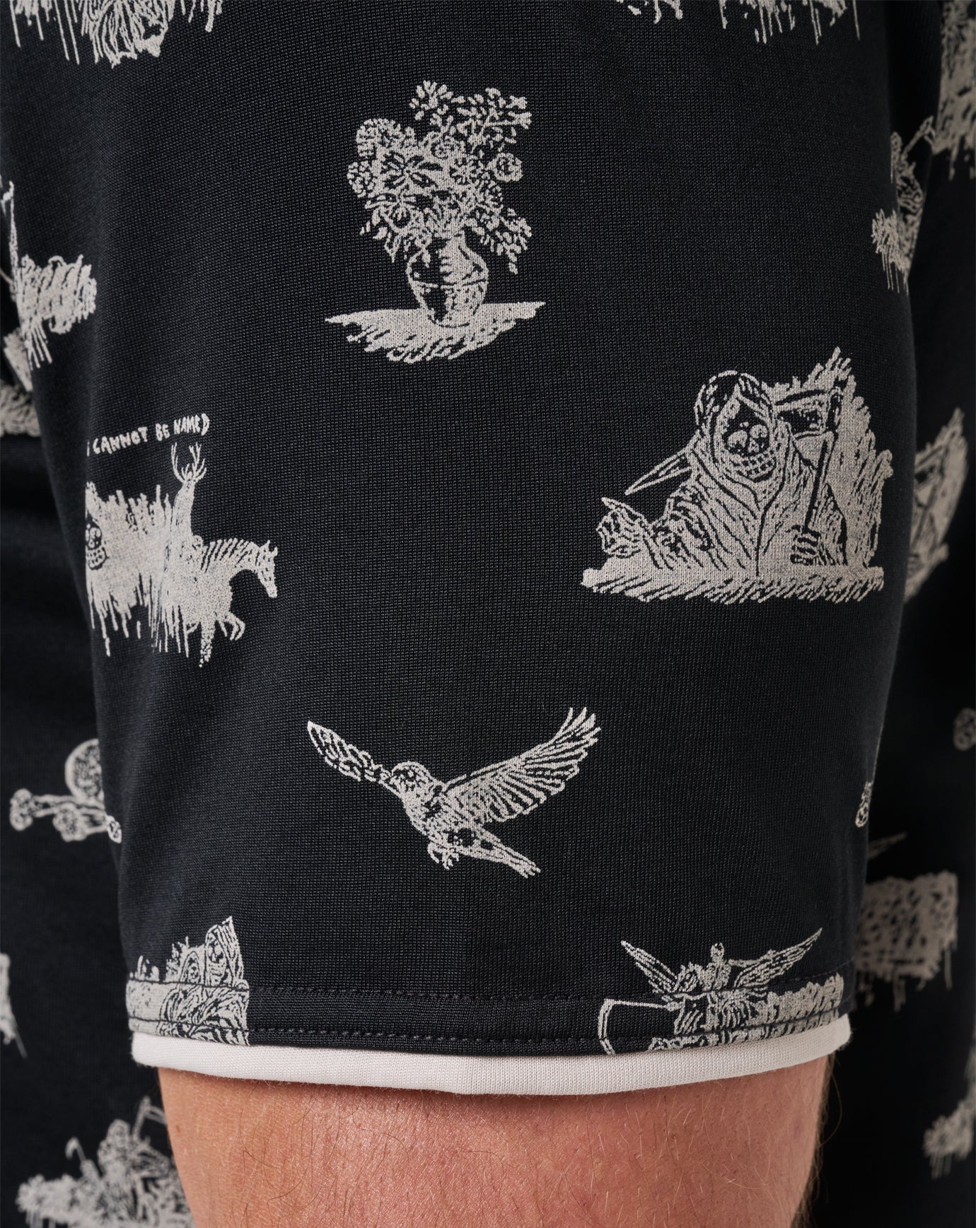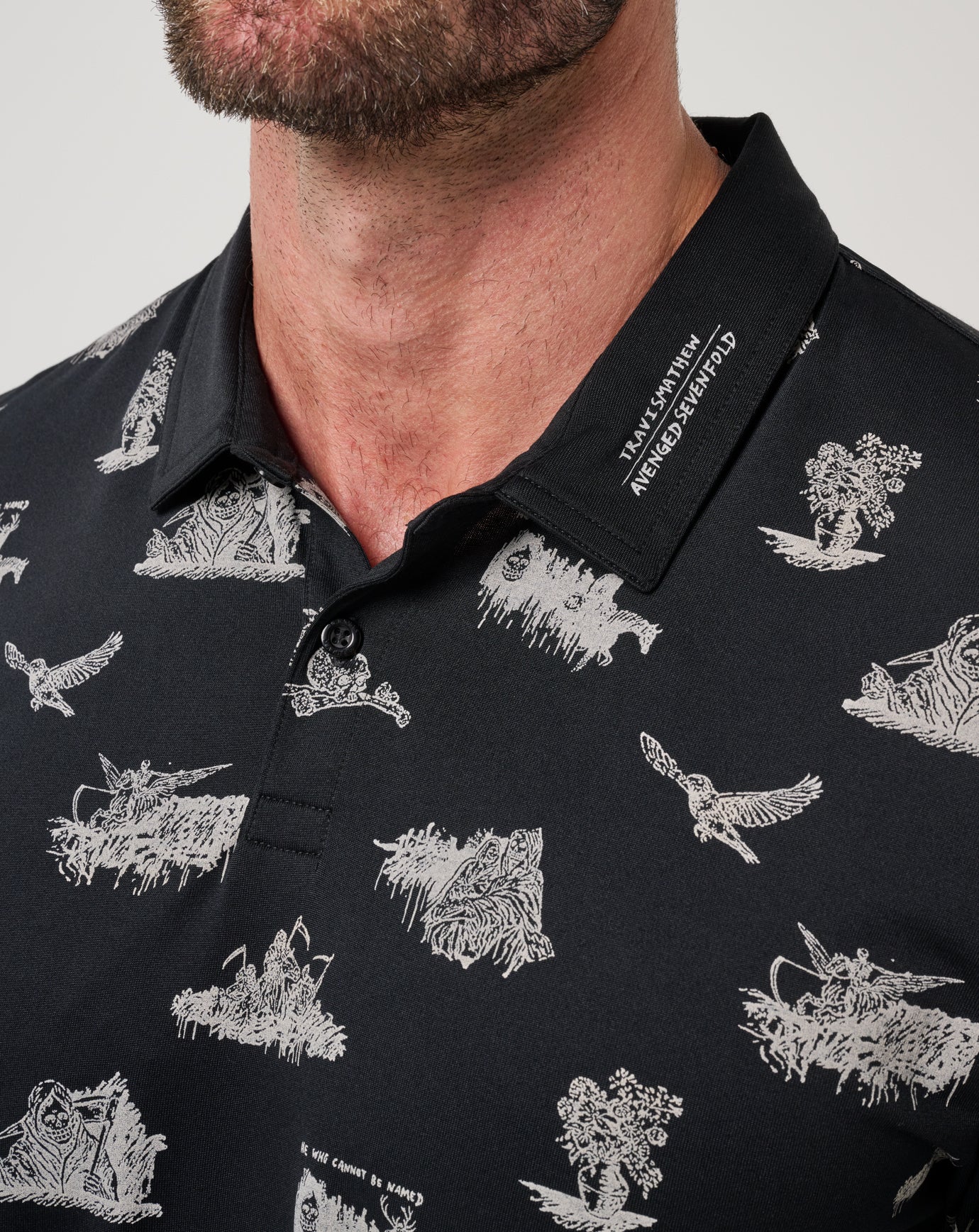 Not your average all-over print. The CITY OF EVIL polo blends subtle chaos with clean design, featuring a pattern of dark iconography inspired by Avenged Sevenfold’s most legendary album. With a scooped hemline, two-button placket, and collar that holds its shape, this one plays loud without saying a word.