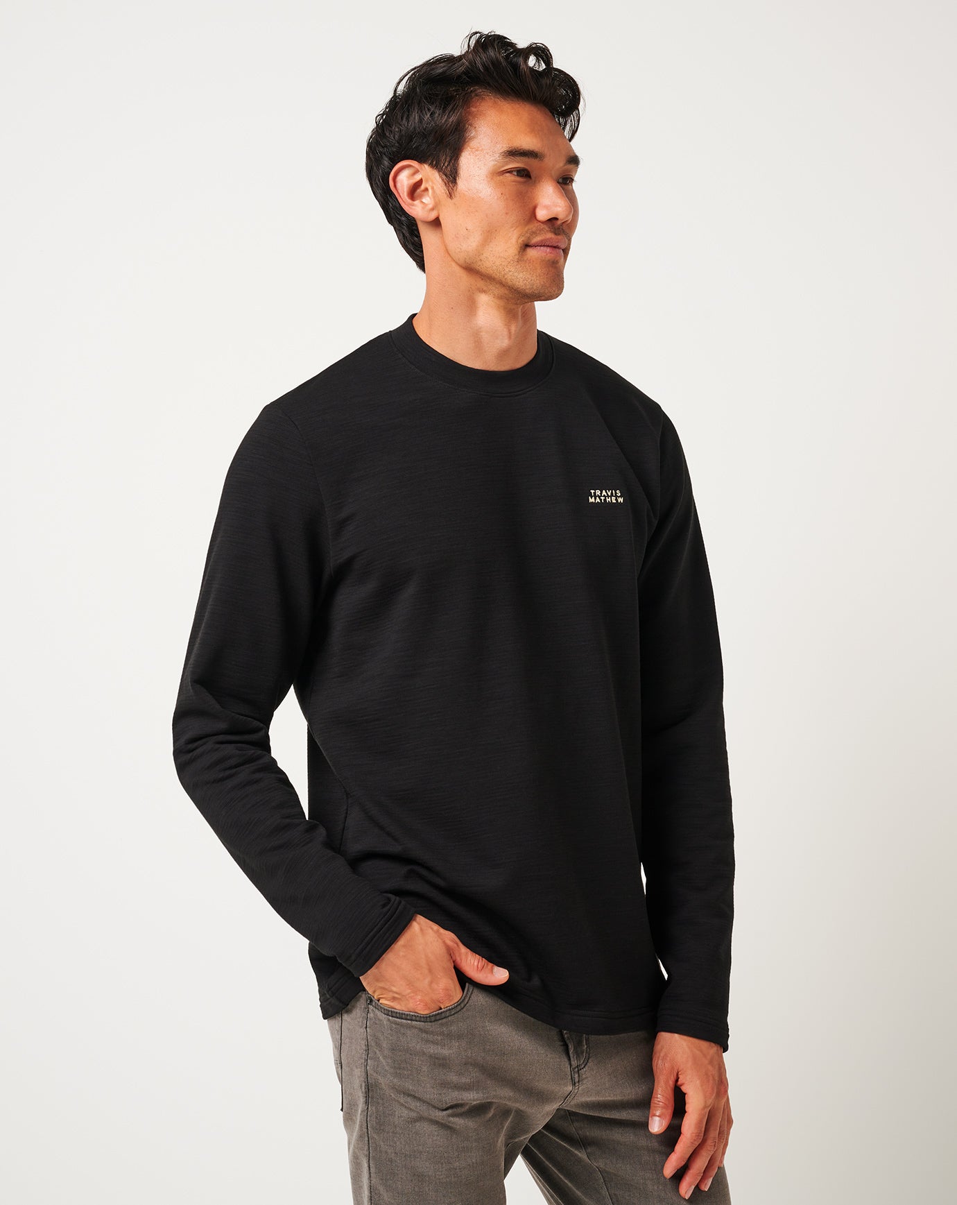 Casual, comfortable, and just a little refined—the MAN ABOUT TOWN, a soft, crewneck pullover sweater, brings effortless style with a clean crew neck, embroidered TravisMathew block logo, and an Italian sand twill tape detail for that extra touch.