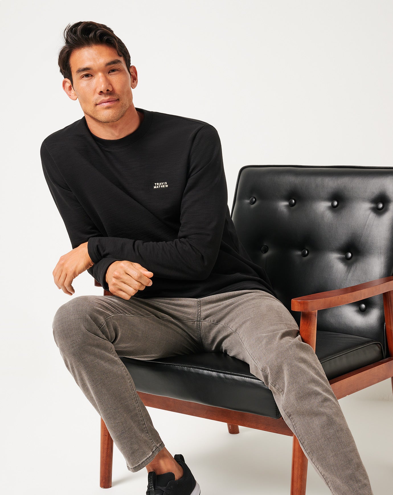 - Embroidered TravisMathew block logo on front left chest.
