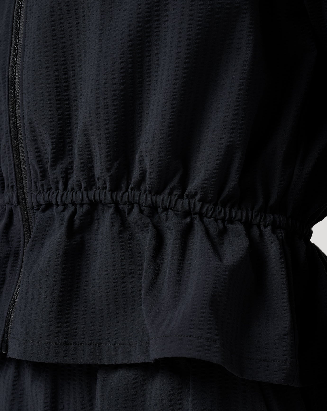 - Textured zip peplum jacket / relaxed fit / interior pocket on wearers left chest/elastic waistband